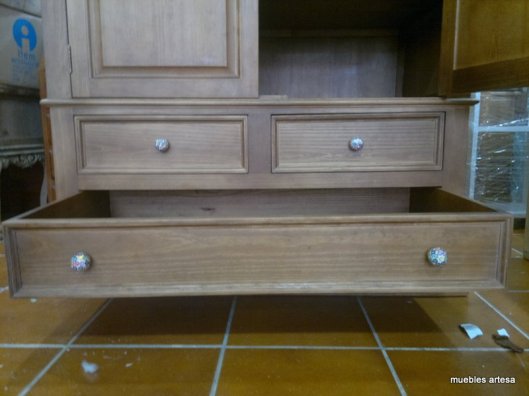 Es desmontable para facilitar su traslado, la parte inferior que contiene los cajones es una pieza y sobre ella se colocan los dos laterales y la trasera, cerrando el mueble la pieza del techo y por último se colocan los estantes interiores y las puertas, es muy sencillo de montar y queda muy estable una vez apretados los tornillos de montaje.