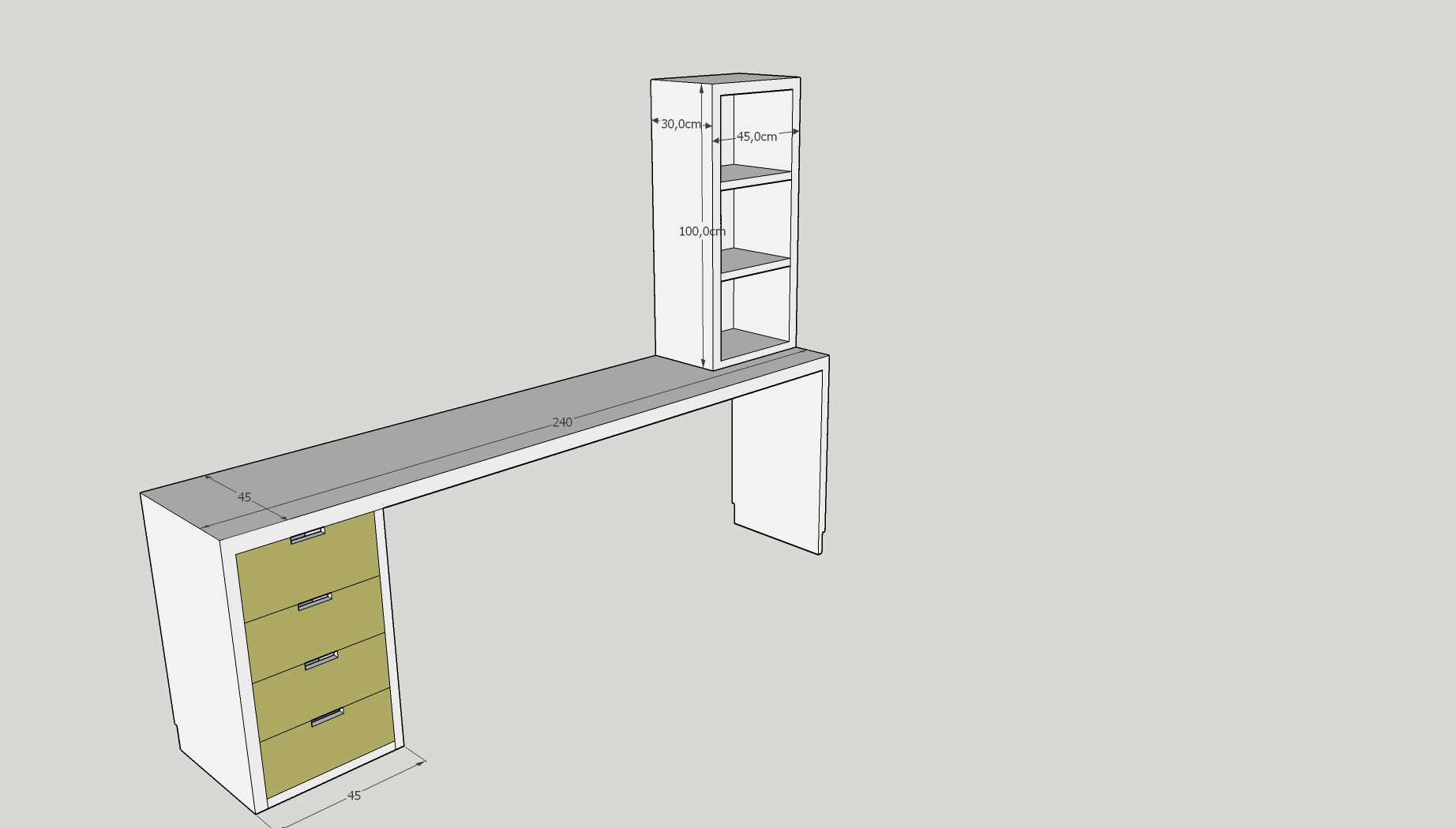Tenemos una habitación de forma rectangular y nos piden que hagamos un diseño que incluya una cama nido para colchones de 105 x190, bastantes cajones grandes para almacenar , un pequeño armario para colgar prendas, y un gran escritorio en la pared contraria.