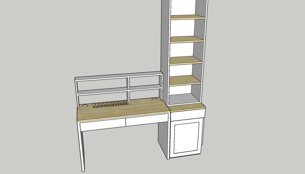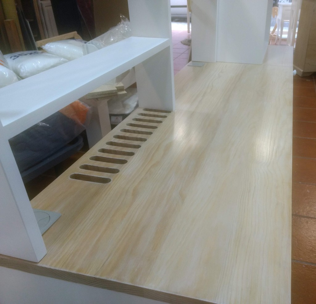 En la tapa fresamos unas aberturas para ventilación del radiador que queda debajo del escritorio y unos pasacables en los laterales. Las piezas llevan rebajes para encajar con el rodapie tanto detrás como en el lateral derecho.