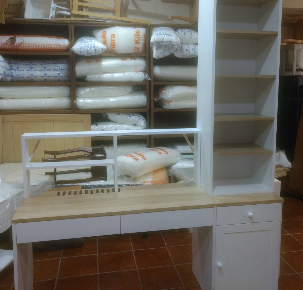 escritorio, estantería, madera de pino, pintado blanco, radiador