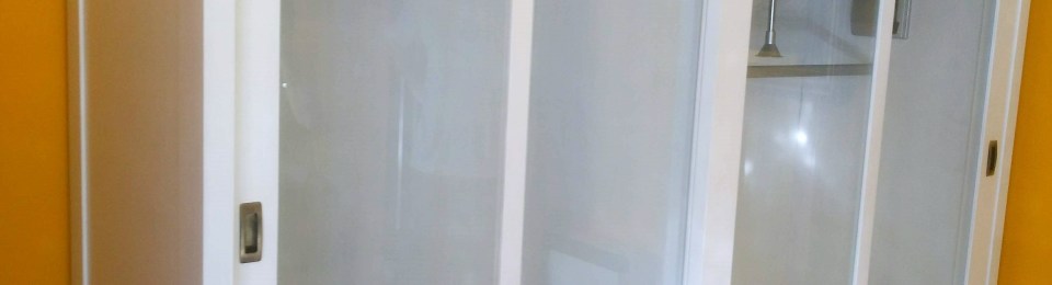 Armario de pino, puertas correderas con cajones, pintado a mano blanco y frentes de cajones barnizados según muestra.