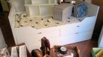 Estantería en dos piezas, la inferior con cajones y puertas para almacenar y la parte superior con estantes para librería, adaptada a las medidas del hueco entre dos ventanas y hasta el techo. Medidas aproximadas 2 metros x0.36×2.65 alto.